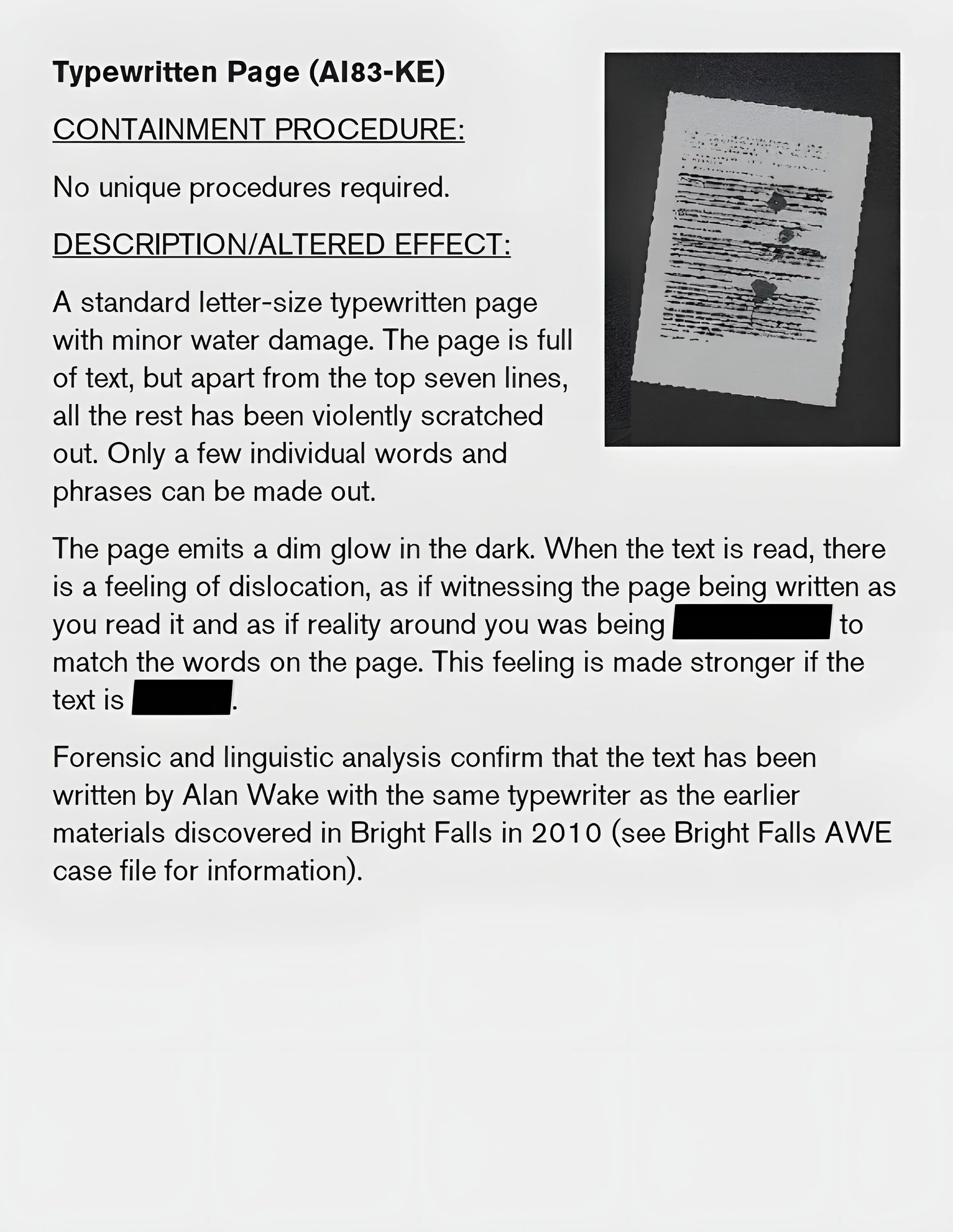 Eylül 2010 — RCU'nun merkezi olayı. Alan Wake, eşi Alice ile birlikte tatil için Bright Falls'a gelir, ancak Karanlık Varlık ile karşılaşır; bu varlık Alice'i kaçırır ve Cauldron Lake'i bir Eşik olarak kullanır. Wake, romanının sayfalarının canlandığını ve gerçeği etkilediğini keşfeder. 15 Eylül 2010'da, FBI ajanları gölde olayları sınıflandırır ve AWE-35olarak tanımlar, ancak yazarın izine rastlayamazlar. Oyun, RCU'nun temellerini atar, AWE'ler ve Değiştirilmiş nesneler kavramlarını tanıtır.