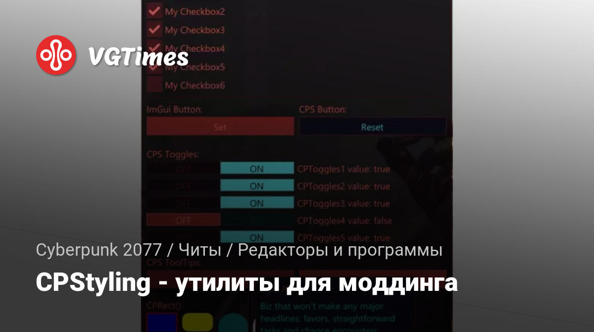 Эта библиотека включает в себя множество утилит и настраиваемых виджетов ImGui, а также настраиваемую цветовую схему, соответствующую пользовательскому интерфейсу Cyberpunk 2077.