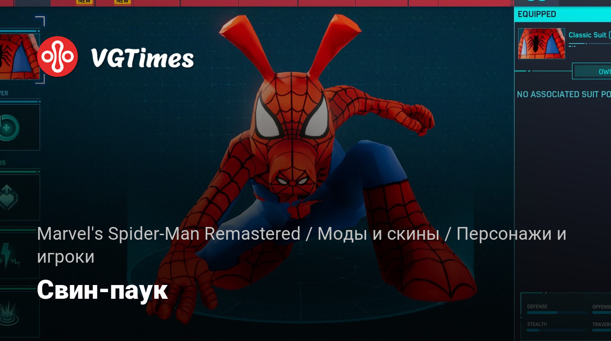 Заменяет классический костюм (поврежденный) на паука-свина. Это также добавляет значок для модели. Когда вы стоите на месте, руки неправильно складываются. Но по большей части они работают нормально.
