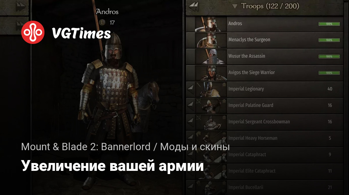 Это простой мод, который поможет увеличить размер только вашей армии в партии. Выберите один размер 200 или 300. Установка по этому пути Mount & Blade II Bannerlord/Modules/.