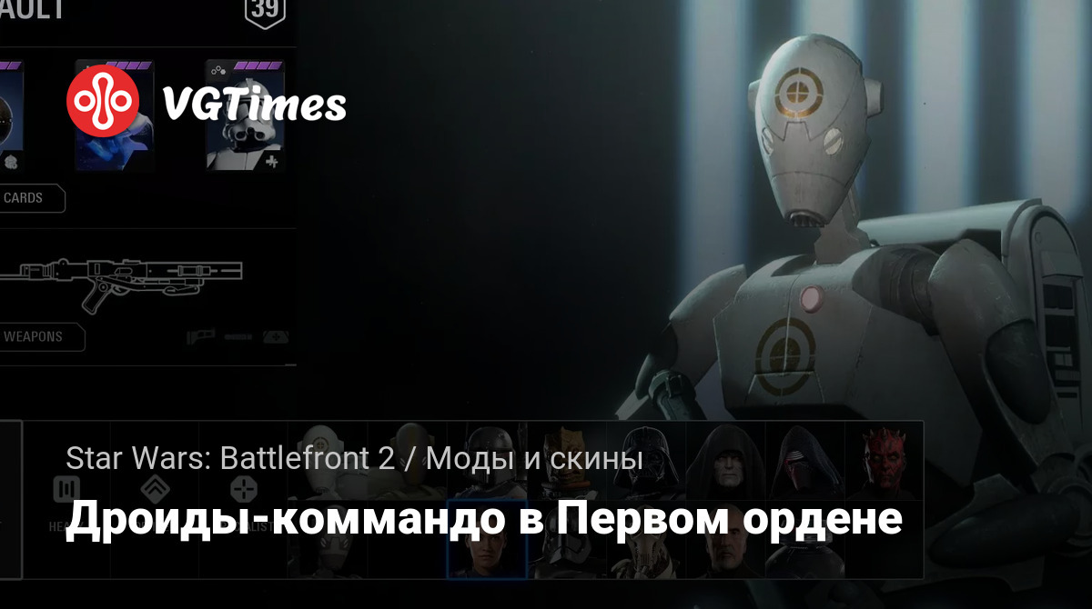 Этот мод заменяет всех солдат Первого ордена на боевых дроидов-коммандо. Также в комплекте новые голоса, звуки и 3 новых портрета.