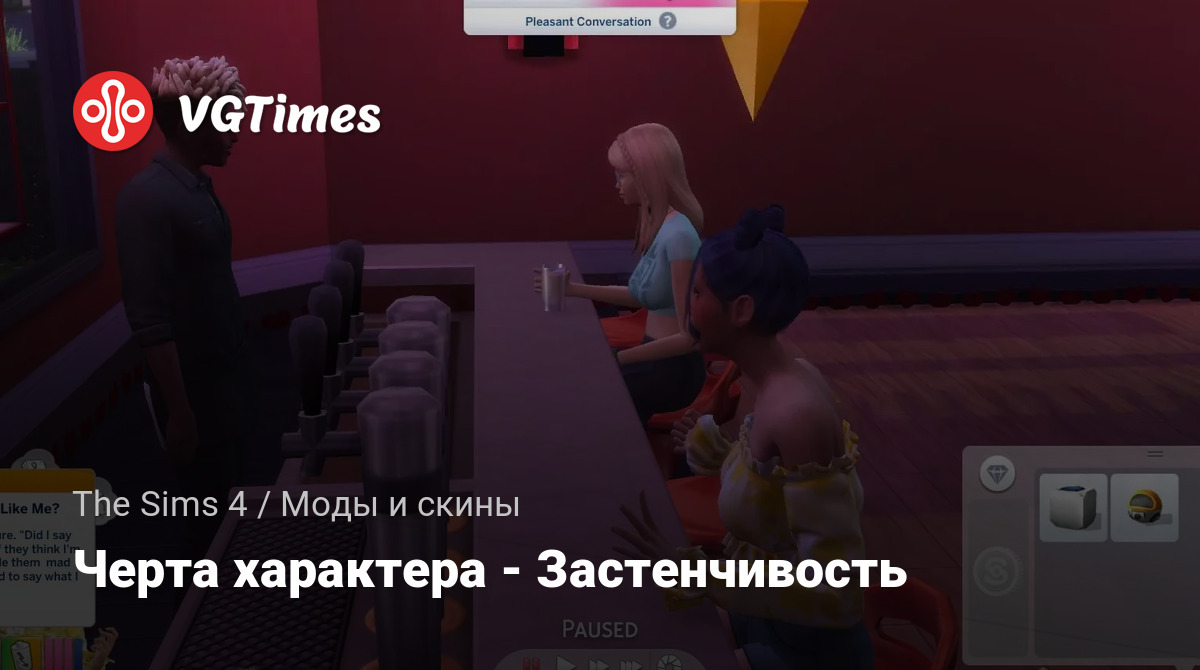 Стеснительная черта: застенчивым симам трудно общаться и выражать себя с другими симами. Они часто чувствуют смущение или напряжение при общении с незнакомыми симами, но чувствуют себя очень счастливыми, когда находятся рядом со своими близкими друзьями. Этим симам может быть трудно сблизиться с другими, но когда они это сделают, они будут вечно лелеять этих друзей. Эта черта находится в социальной категории.