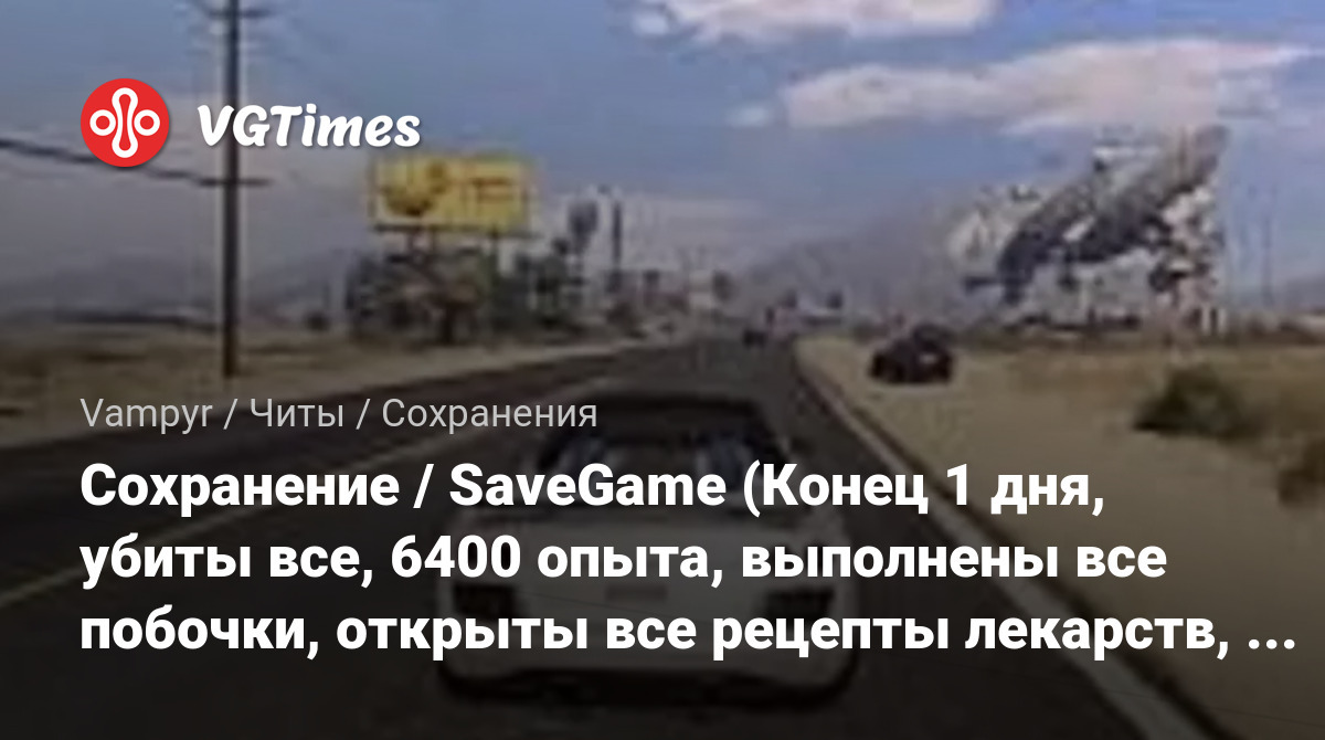 Сохранение / SaveGame (Конец 1 дня, убиты все, 6400 опыта, выполнены все побочки, открыты все рецепты лекарств, 3 лвл, без убийств НПС)