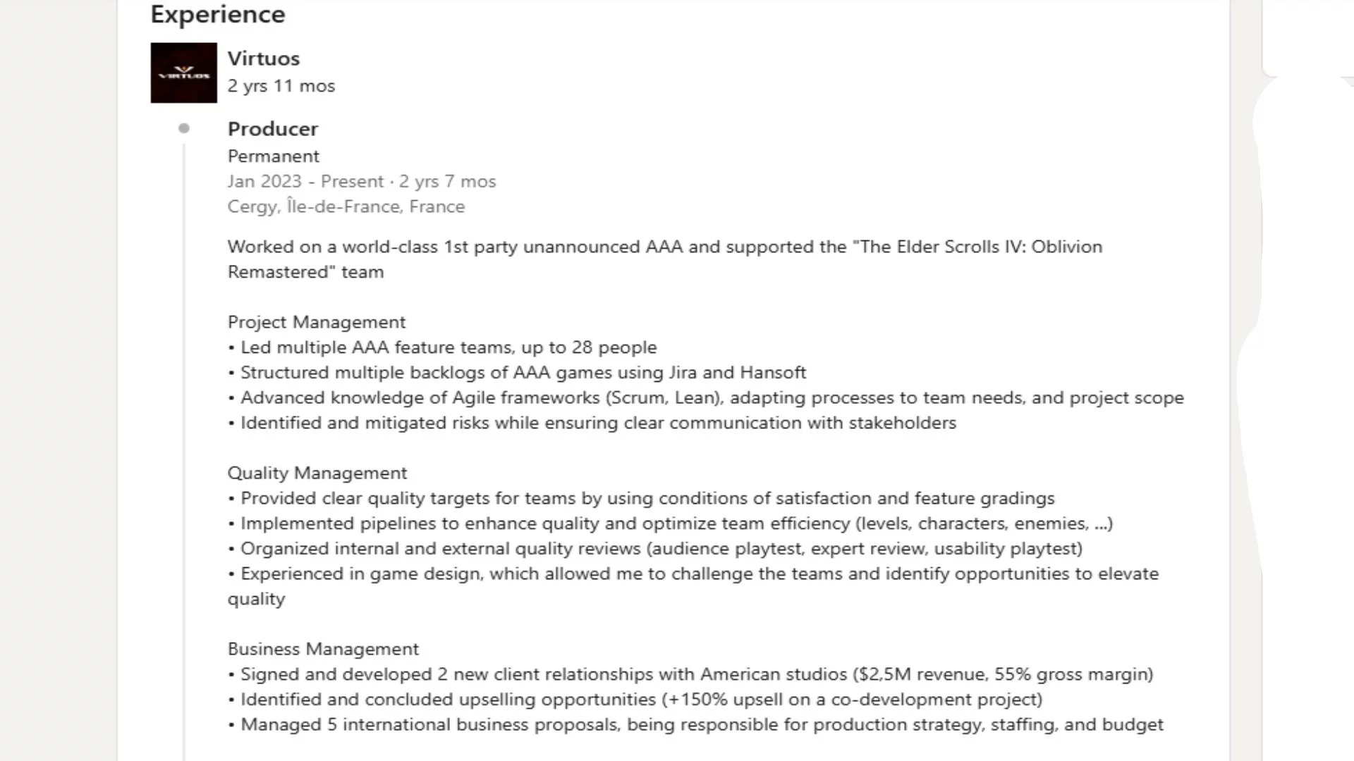 "Dünya çapında birinci taraf duyurulmamış bir AAA üzerinde çalıştım ve The Elder Scrolls 4: Oblivion Remastered ekibini destekledim."