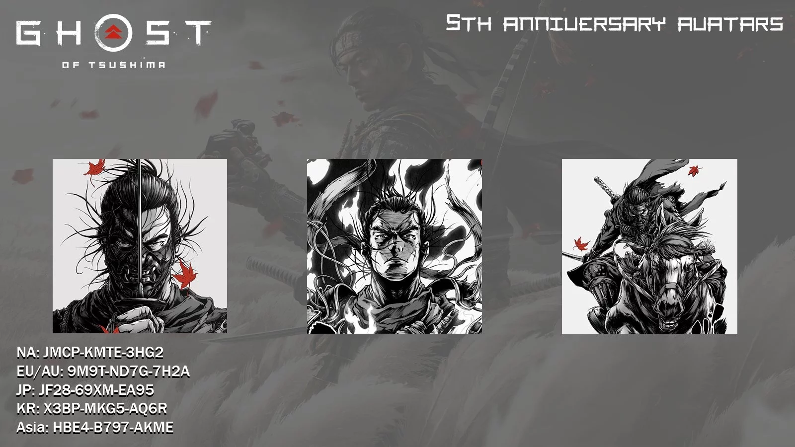 On July 17, aksiyon-macera oyunu Ghost of Tsushima beşinci yıl dönümünü kutladı. Bu özel günü anmak için Sucker Punch, hayranları için özel bir hediye hazırladı: ünlü sanatçı Takashi Okazaki tarafından tasarlanan, baş karakter Jin Sakai'yi içeren üç ücretsiz PSN avatarı.