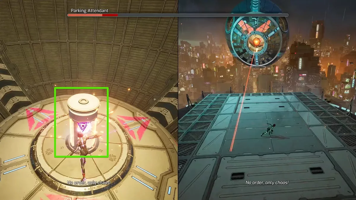 Sonraki aşamada, ileriye doğru koşmanız gereken bir platform seviyesine gireceksiniz, engelleri aşarak ve lazer ışınından kaçınarak. Kendinizi bir çıkmazda bulduğunuzda, arabaların sağındaki platformun aşağı düşmesini bekleyin. Asansörle çatıya çıktığınızda, patron savaşı başlayacak.