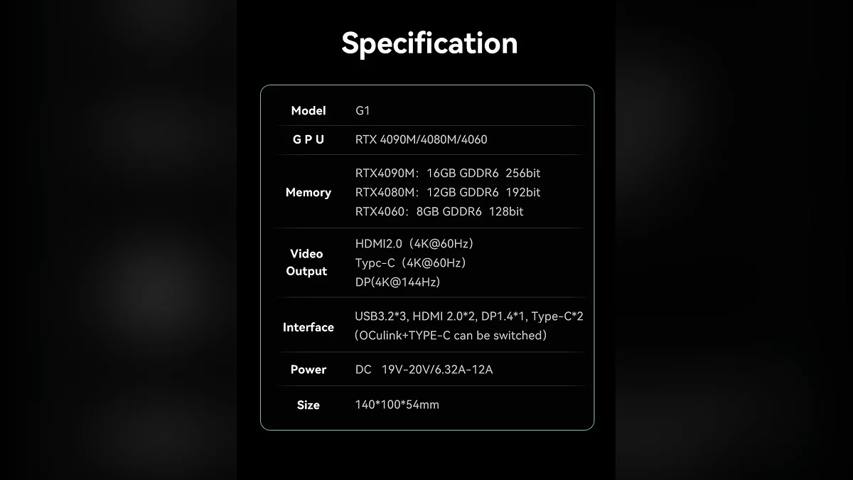 G1'in ana yeniliği, çeşitli kullanım senaryolarına uyum sağlayan değiştirilebilir arayüz modülünde yatmaktadır. Maksimum performans için bir modül, 85W şarjı destekleyen bir USB-C portunun yanı sıra OCuLink portu (PCIe 4.0 x4, 64 Gbps'ye kadar) içermektedir. OCuLink portu olmayan PC'ler için, iki USB-C portuna sahip alternatif bir modül mevcuttur. Bu çok yönlülük, G1'i özel arayüzlere sahip olmasa bile dizüstü bilgisayarlar ve mini-PC'ler için mükemmel bir eşleşme haline getiriyor.