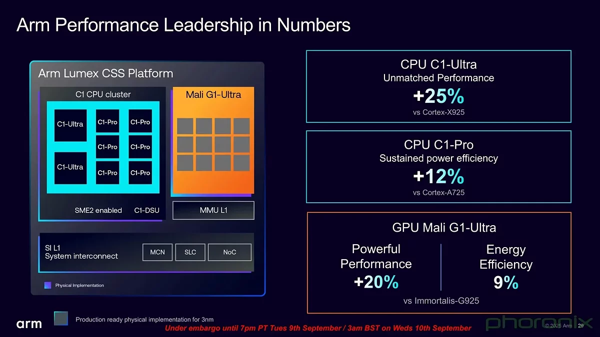 Yeni çekirdekler, önceki nesil Cortex-X925'e göre %25 performans artışı sağlamak için 3nm süreç üzerine inşa edilmiştir. Ancak en büyük değişiklik, yüksek performanslı C1-Ultra ve C1-Premium ile enerji verimli C1-Pro ve C1-Nano'yu içeren yeni dört katmanlı çekirdek yapılandırma sistemidir. Bu çekirdek türleri karışımı, cihaz üreticilerine farklı pazar segmentleri için çip tasarlarken daha fazla esneklik sağlayacaktır. Örneğin, Premium çekirdek, Ultra ile karşılaştırılabilir bir performans sunar ancak %33 daha az alan kaplar.